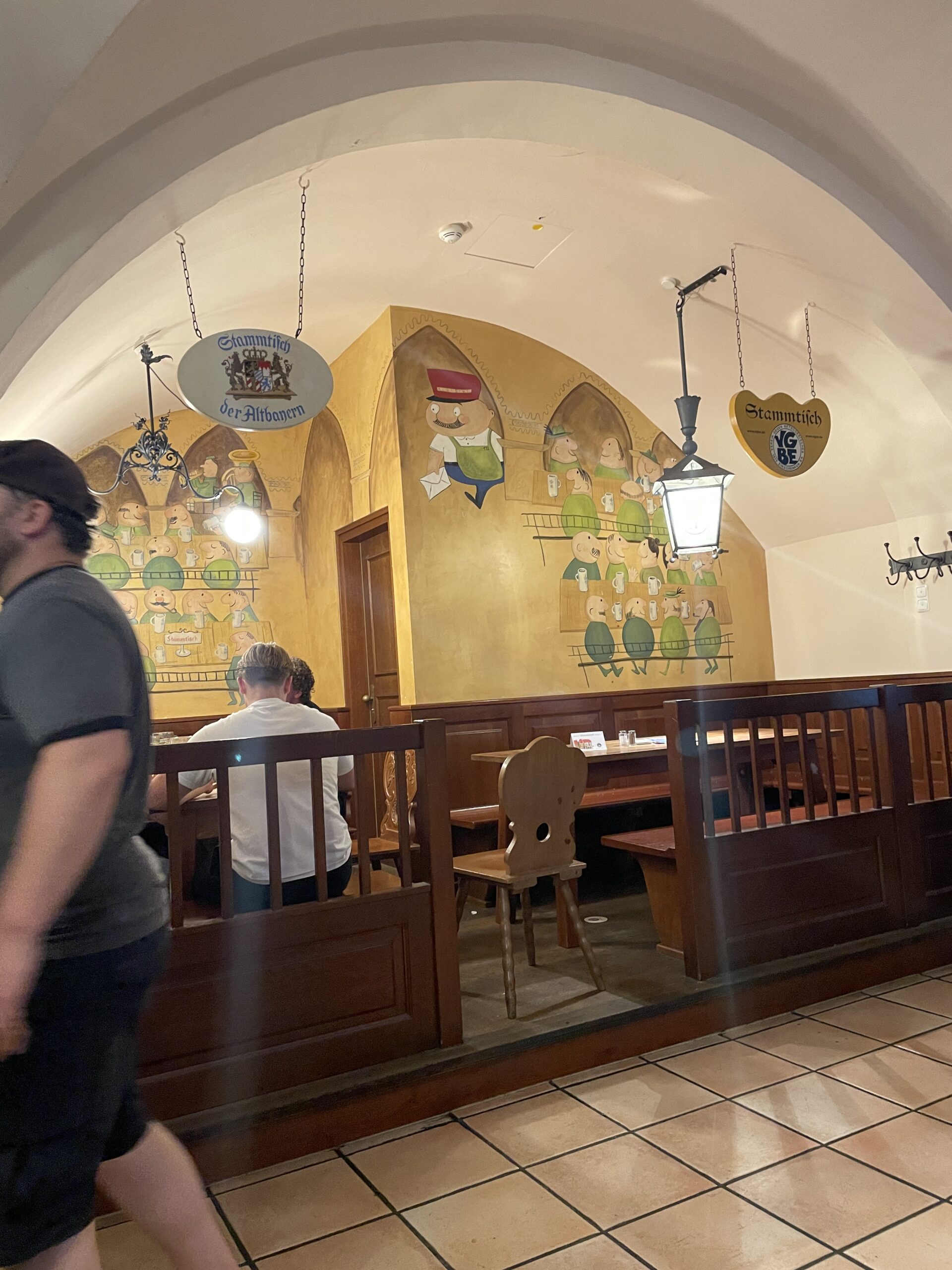 ここでほぼ月1回必ず上演されるのが、この地域の昔から伝わるAloisiusアロイジウスの物語だ。バイエルンの作家ルートヴィヒ・トーマ(1867~1921)の„Der Münchner im Himmel ”(『天国にいるミュンヘンの男』)という作品である。話の内容は、次のようなものである。ミュンヘン出身の男アロイジウスはミュンヘン駅で荷物を運搬する仕事をしていたが、ある日そこで急死してしまい天国に召される。天国での彼は退屈な日々にイライラしている。神様から課されていた彼のハープの演奏は散々なもので、天国でひどい騒音となって天使たちから苦情がでてしまうほどであった。そういうこともあって、神様はアロイジウスを呼び、ミュンヘンのバイエルン政府に手紙を届けるよう命じる。そしてミュンヘンの空にひらひらと現れたアロイジウスはなんと約束の場所へ向かわず、ビアホールに行ってしまう。そこで彼はおいしいビールをひたすら飲んで、飲んで、飲み続け、本来の目的を忘れてしまい、未だに手紙が届けられていない。