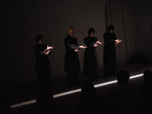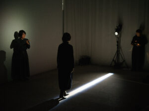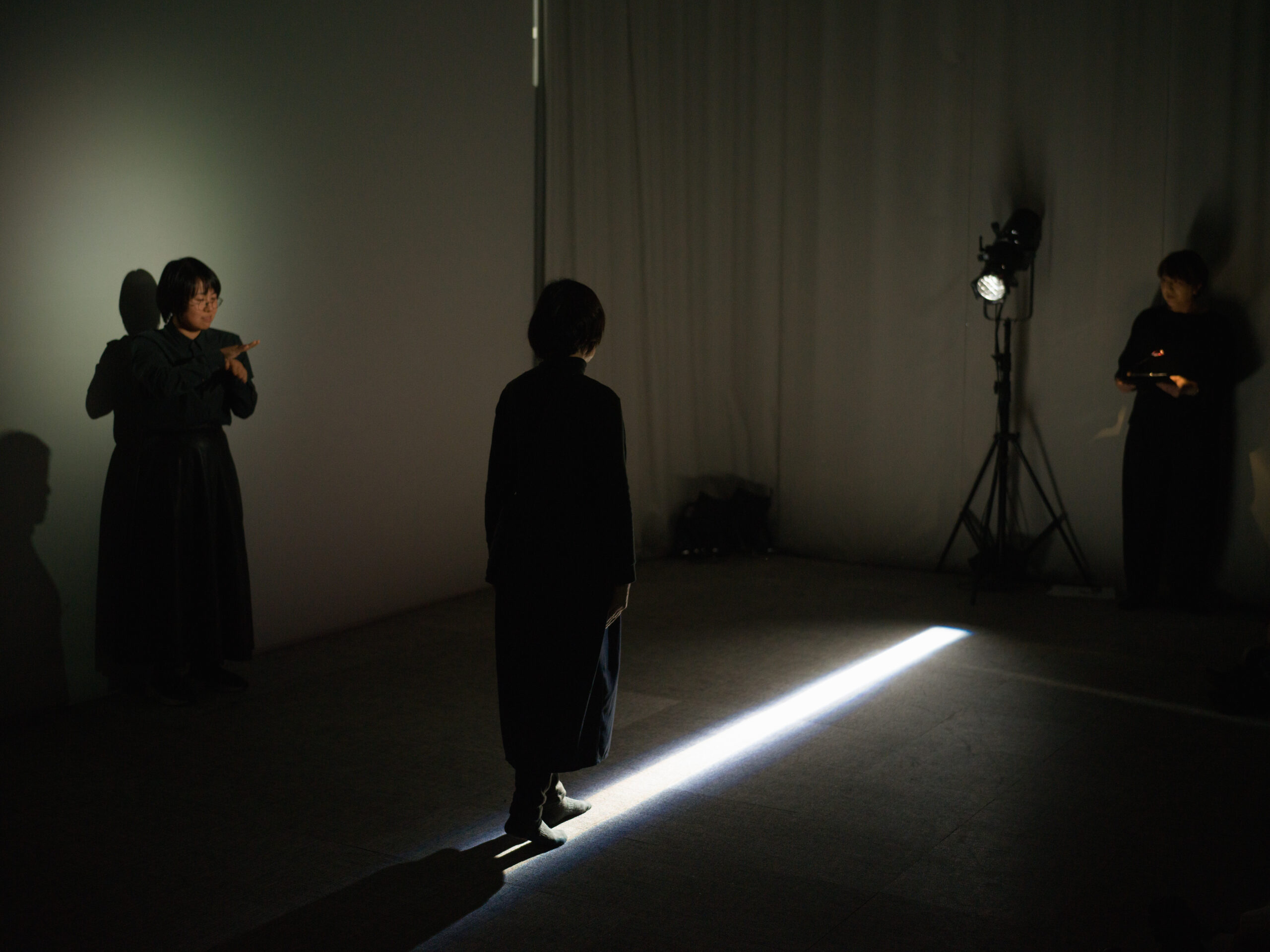 もっとも印象的なのは、終盤でカーテンがすべて閉められ、空間が闇に近づく場面である。床には光の束が一本走り、その境界の上をパフォーマーがゆっくりと歩く。中央奥の手話通訳者、光の線の上を進む身体、そしてそのなかで朗読される「通訳者の存在のうつくしい消え方」は、今回の上演ではテクストとして強調されていたというより、むしろ空間の構図そのものとして経験された。