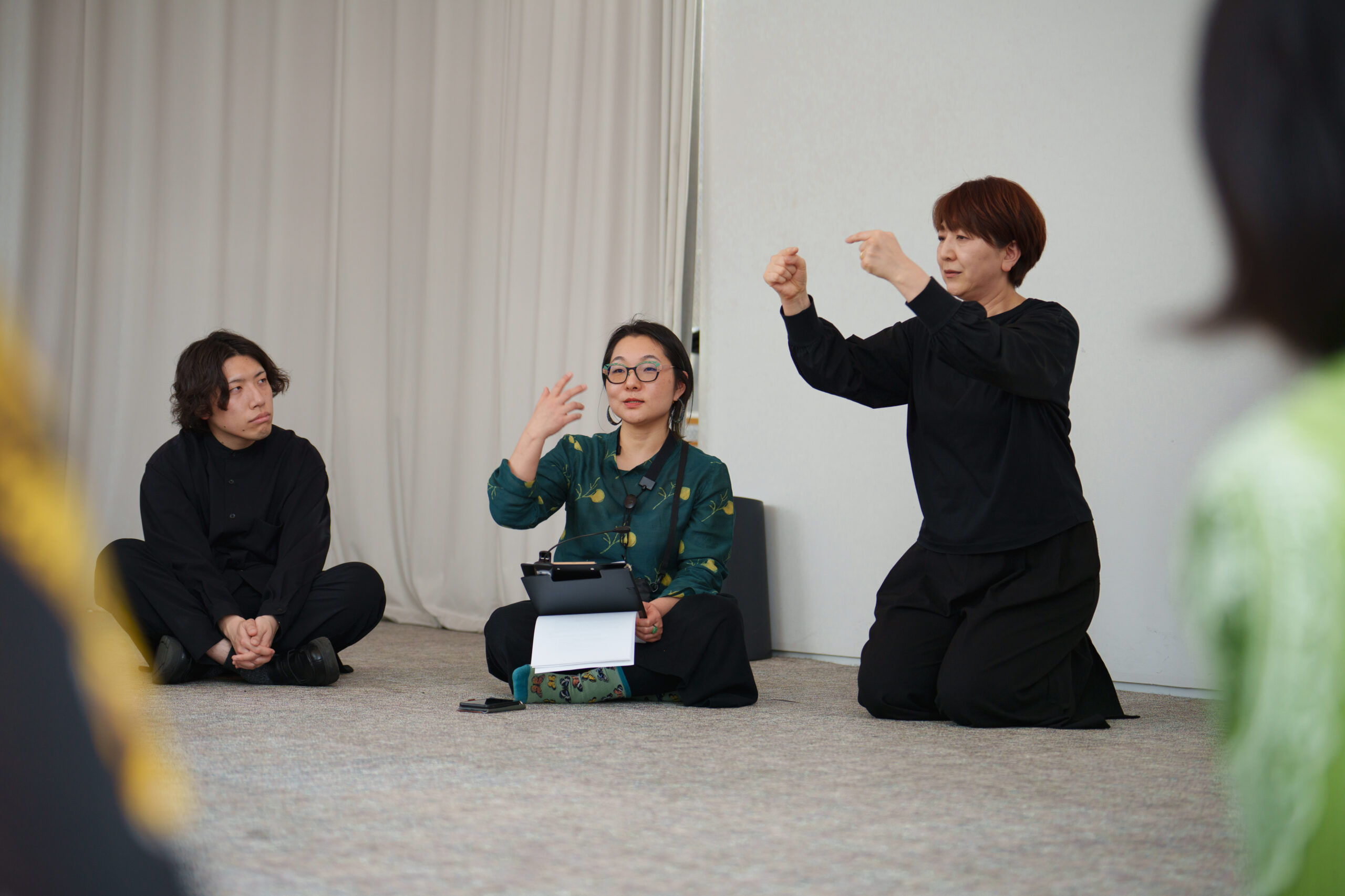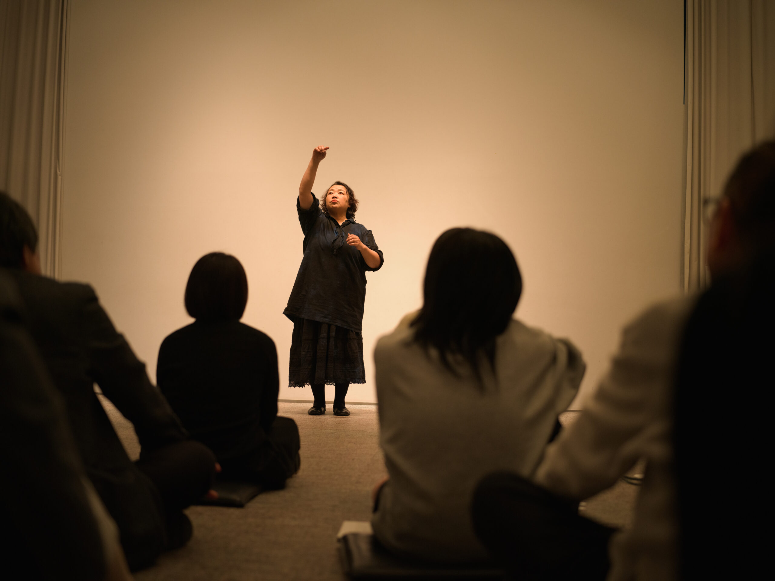 その構造は、会場であるSHIBAURA HOUSE 5Fの空間にも明確に現れていた。そこには客席がない。観客は床に車座に座り、舞台と客席の区別は最初から曖昧である。観客は「見る者」としての安全地帯を持たず、上演の進行とともに少しずつその内部へ引き入れられていく。当日配布資料でも出演者は「不透明性のアンサンブル」と「観客のみなさま」とされ、しかも上演回ごとに出演構成は異なっていた。