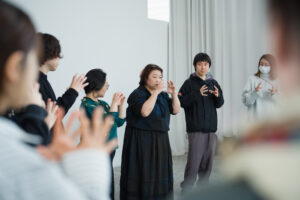 後半で、聾者のパフォーマーが中心になり、観客がやや引いた位置に置かれる場面が訪れると、ここまで曖昧だった観客と演者の境界は、いったん逆説的に可視化される。つまりこの作品は、最初から最後まで「みんな一緒」を維持するのではなく、どこで境界が曖昧になり、どこで境界が再び立ち現れるのかを細かく操作している。その点で、この上演は単なる共同性の演出ではなく、共同性の条件そのものを試してもいたのである。
