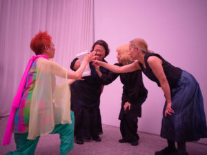 実際、上演は「今の気持ち」をめぐるやりとりから始まり、その後しばらく「声のない時間」が続く。観客は一人のパフォーマーの指示に「何となく」従い、さらに肩に触れる、驚いた顔をする、両手を差し出す、怒った顔をつくる、重い物を渡すふりをするといった、細かなジェスチャーの連鎖に巻き込まれていく。別のパフォーマーによって、それはより大きな身ぶりへと変えられる。つまり導入部で起きているのは、「参加」そのものではなく、他者の身ぶりに身体を合わせるための調律である。観客は自己表現する主体としてではなく、まず見ること、触れること、真似ること、遅れて反応することを通じて、場の一部になっていく。