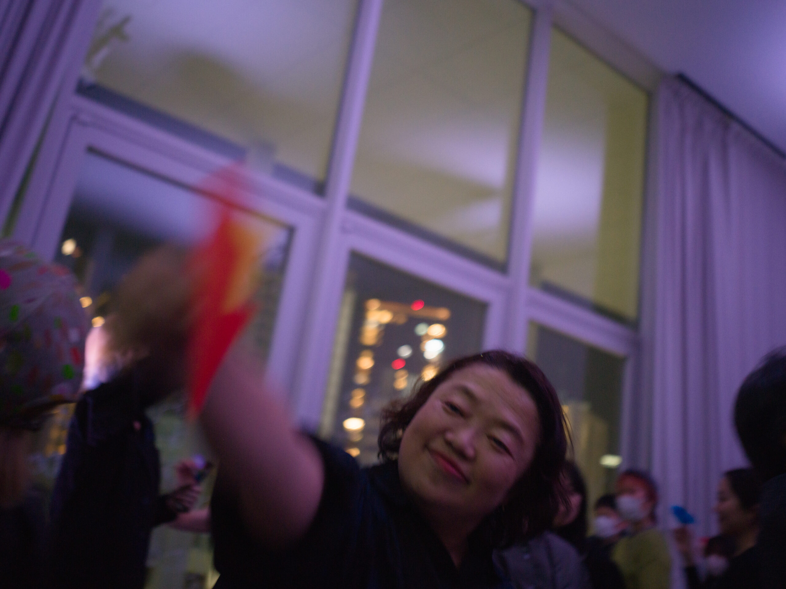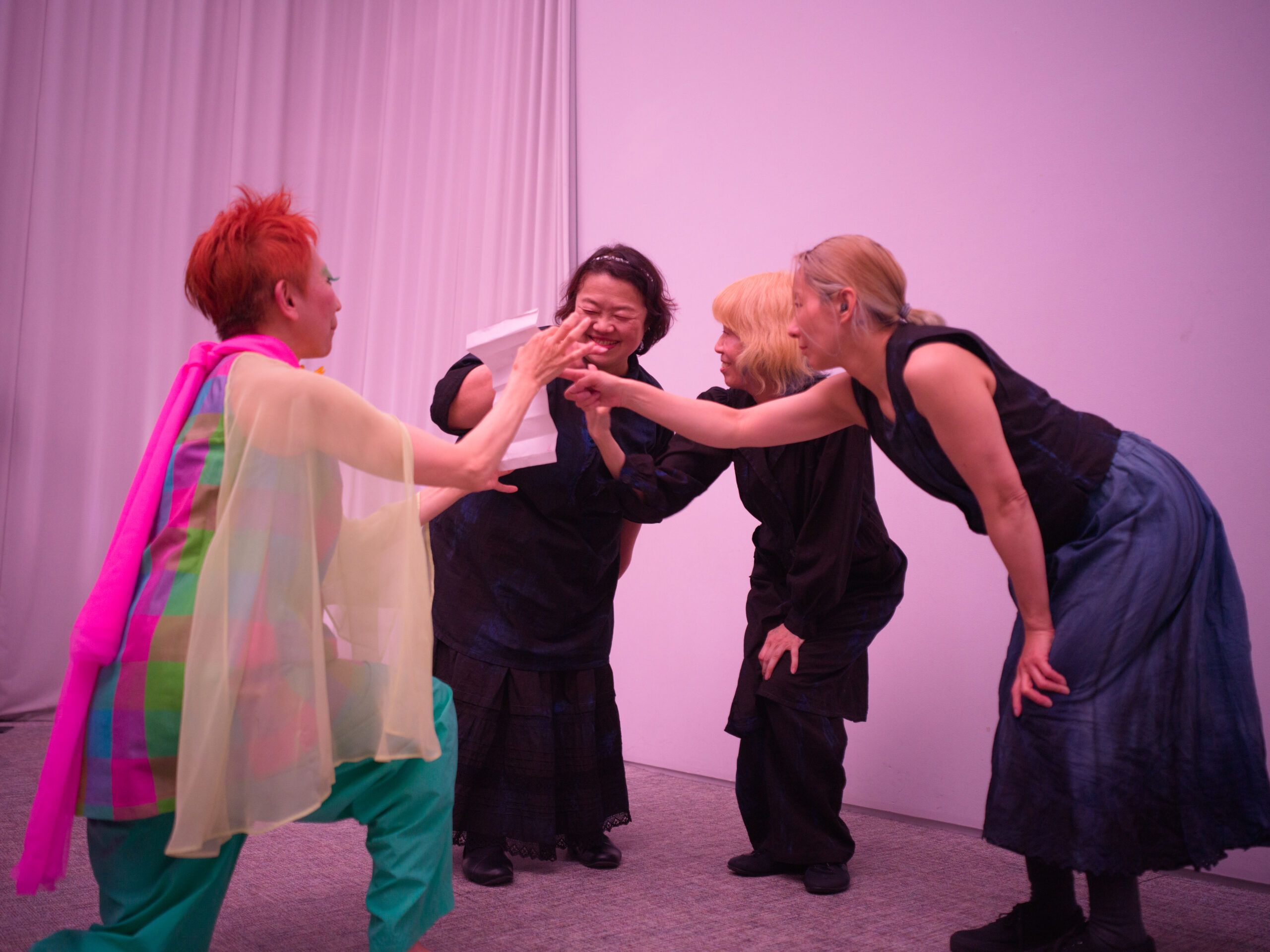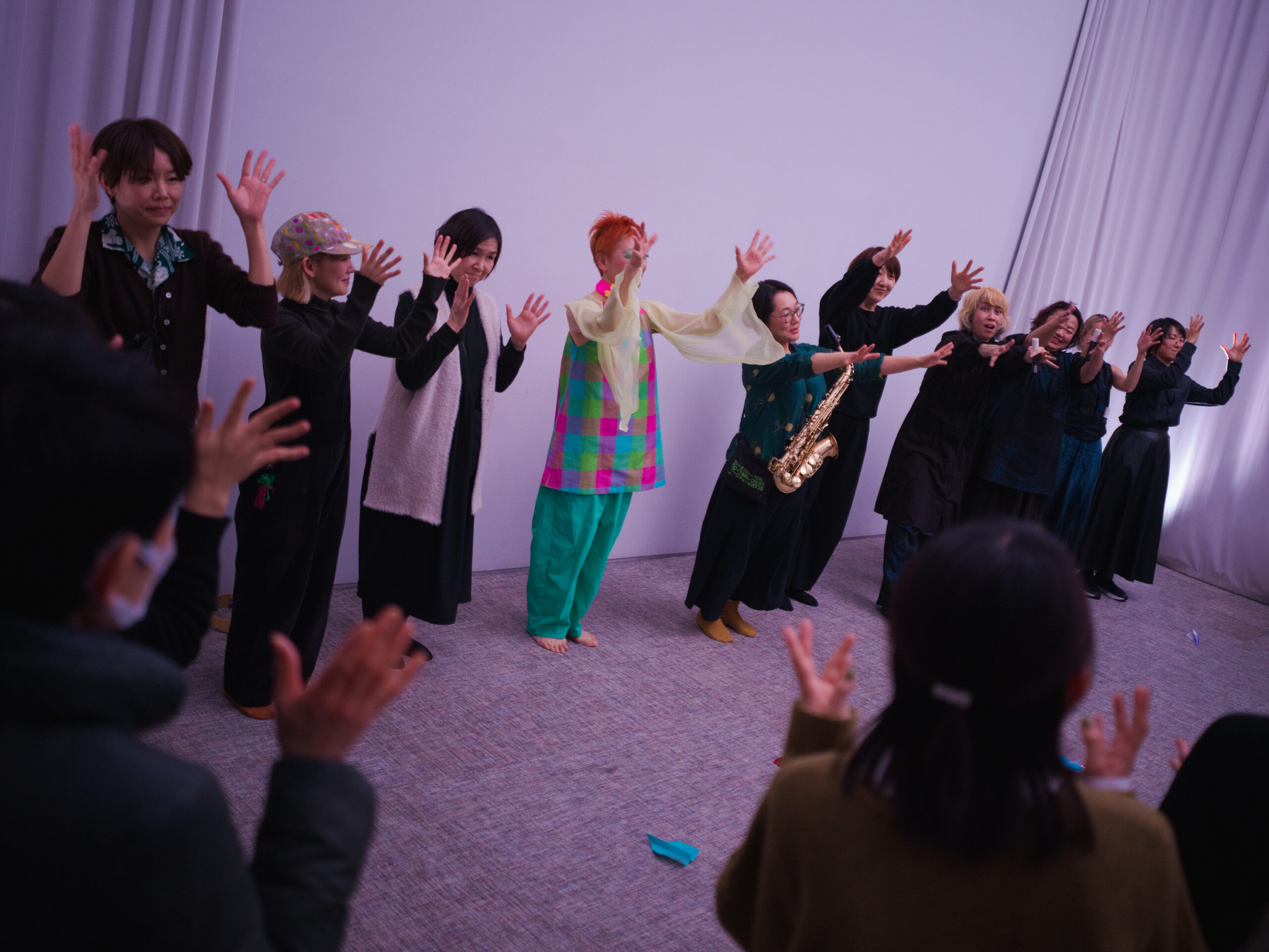 そのあとカーテンが開き(「カーテンを開く。光を入れる。」)、夜のSHIBAURA HOUSEの窓の向こうにビル街の光が見えると、空間の位相は大きく変わる。パフォーマーたちは白いフェルトペンで窓ガラスに聾者による音楽の表し方としての一つのかたちである手符を描き始め、タンバリン、サクソフォン、ヴァイオリンの音が加わる。さらに観客には色紙が配られ、紙飛行機を折って飛ばすことが促される。だがここでも、雰囲気は「和やか」ではなく、むしろどこか厳粛で、不協和音を含んだままである。観客は全員立ち上がり、紙飛行機を手に空間を歩き回るが、それは解放感の演出というより、伝達が宙づりのまま漂い続ける場の生成に近い。最後に照明が明るくなり、全員が手話の拍手で終演を迎えるとき、ようやくこの作品が目指していたのが、理解でも融和でもなく、共に在ることの不確かさを引き受けるための時間だったことが見えてくる。
